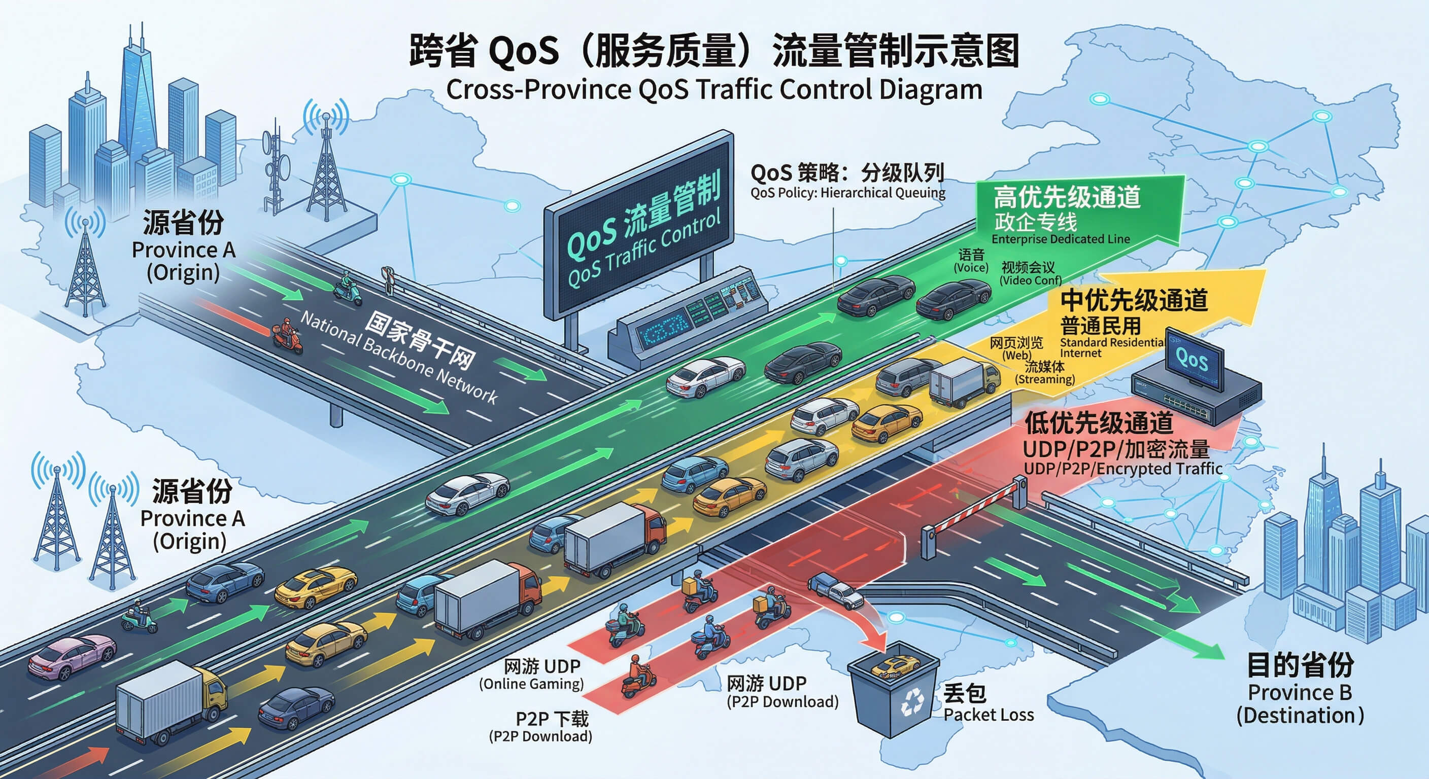 但用户口中的“被跨省 QoS 了”,通常不是在谈正规的网络保障策略,而是在描述一种结果:同样是这条宽带,访问本省资源很正常,访问外省资源却掉速、抖动、丢包,晚高峰尤其明显,给人的感觉像是“跨省流量被限了”。这是一种用户体感上的总结,而不是严格的设备配置名词。